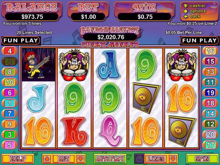 Many of RTG's older slots ran through Flash and downloadable software. Mobile devices don't support either of these options, meaning you won't be able to play Funky Monkey on a smartphone or tablet. Your best option is to play on a desktop and use a Flash emulator like Ruffle to access this game.
